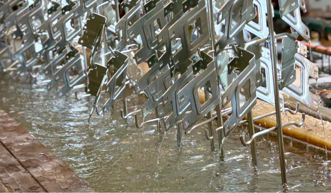 Línea de galvanoplastia con zincado trivalente electrolítico en acabados azul claro y tropicalizado, capaz de procesar piezas desde 60 × 40 × 30 mm hasta 2.85 m de longitud y 1,600 kg de peso. Se logran espesores de recubrimiento de 8 a 15 micras, con resistencia a la corrosión de hasta 800 horas en cámara salina. El proceso opera con un flujo aproximado de 1.3 cargas por hora, garantizando protección anticorrosiva uniforme en distintas aplicaciones industriales.